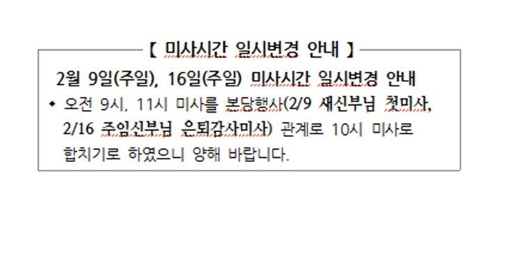 미사시간 일시변경 안내 페이지 정보 작성자 사무실 댓글 0건 조회Hit 877회 작성일Date 25-01-23 09:42 본문 미사시간 일시변경 안내 목록 이전글설 합동위령미사 ( 1월 29일 수요일 ) 25.01.23 다음글기부금 영수증 발급 지침(변경) 안내 25.01.16 댓글목록 댓글목록 등록된 댓글이 없습니다.