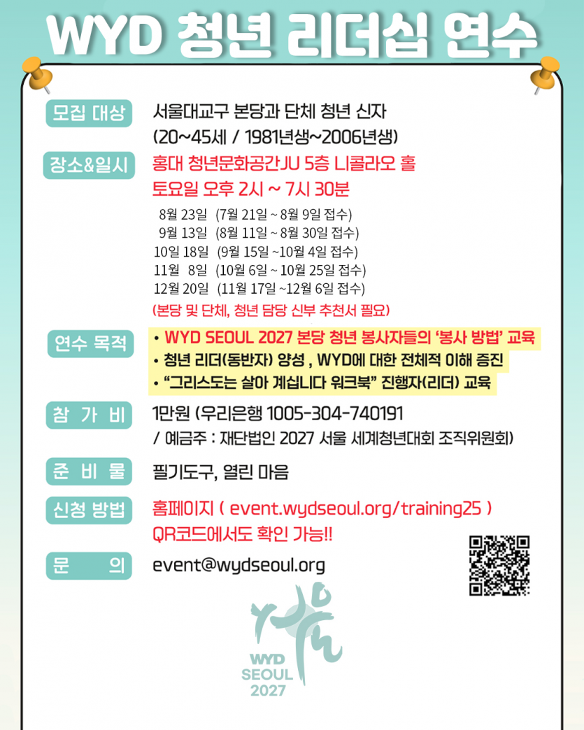 2027 서울 WYD 지역조직위원회(이하 조직위)에서는 기존의 “WYD 청년 연수”를 개편하여 ‘WYD 청년 리더십 연수’로 새롭게 진행합니다.