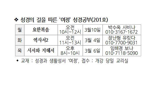 성경의 길을 따른 ‘여정’ 성경공부(201호) 페이지 정보 작성자 사무실 댓글 0건 조회Hit 776회 작성일Date 25-03-06 09:14 본문 성경의 길을 따른 ‘여정’ 성경공부(201호) 목록 이전글성령기도회 25.03.06 다음글남성 그룹 성경 공부 모집(개강 : 4/4 금) 25.03.06 댓글목록 댓글목록 등록된 댓글이 없습니다.