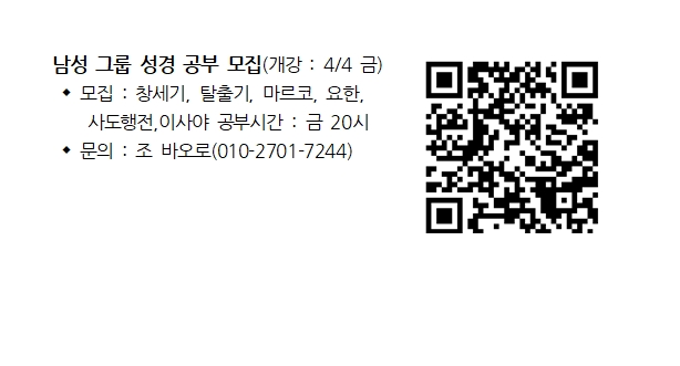 남성 그룹 성경 공부 모집(개강 : 4/4 금) 페이지 정보 작성자 사무실 댓글 0건 조회Hit 819회 작성일Date 25-03-13 11:02 본문 남성 그룹 성경 공부 모집(개강 : 4/4 금) 목록 이전글축복받은 성경 읽기 (마르코복음 3/26 수요일 시작) 25.03.13 다음글청년공동체 모집 - 청년단체 체험데이 25.03.13 댓글목록 댓글목록 등록된 댓글이 없습니다.