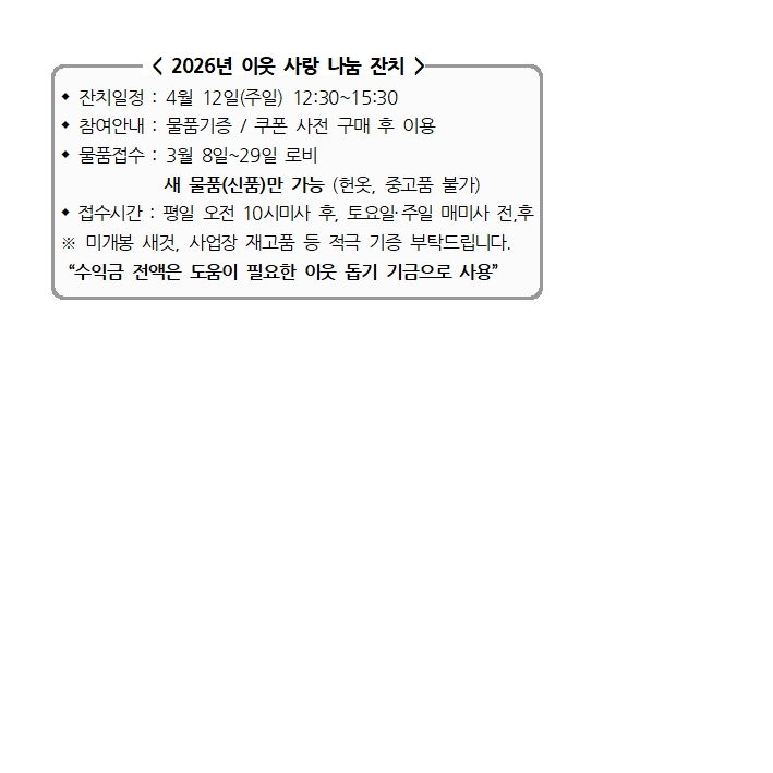 2026년 이웃 사랑 나눔 잔치 페이지 정보 작성자 사무실 댓글 0건 조회Hit 28회 작성일Date 26-03-12 09:57 본문 2026년 이웃 사랑 나눔 잔치 목록 이전글전입교우 환영식 26.03.12 다음글첫영성체 일정 안내 26.03.12 댓글목록 댓글목록 등록된 댓글이 없습니다.