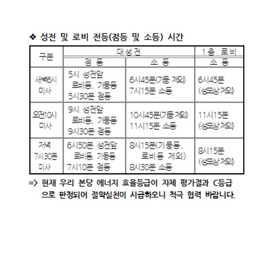 성전 및 로비 전등(점등 및 소등) 시간 페이지 정보 작성자 사무실 댓글 0건 조회Hit 829회 작성일Date 25-07-17 16:44 본문 성전 및 로비 전등(점등 및 소등) 시간 목록 이전글혹서기 전례 안내 25.07.17 다음글목동성당 세계청년대회 로마 순례 공지 25.07.17 댓글목록 댓글목록 등록된 댓글이 없습니다.