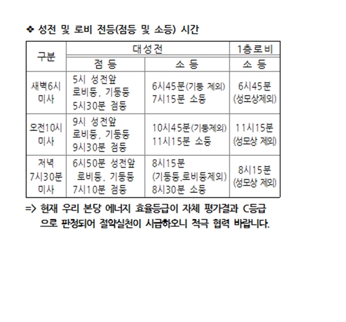 성전 및 로비 전등(점등 및 소등) 시간 페이지 정보 작성자 사무실 댓글 0건 조회Hit 818회 작성일Date 25-08-02 15:04 본문 성전 및 로비 전등(점등 및 소등) 시간 목록 이전글가족미사 함께 참여하기 운동 25.08.02 다음글성모승천대축일 미사 25.08.02 댓글목록 댓글목록 등록된 댓글이 없습니다.