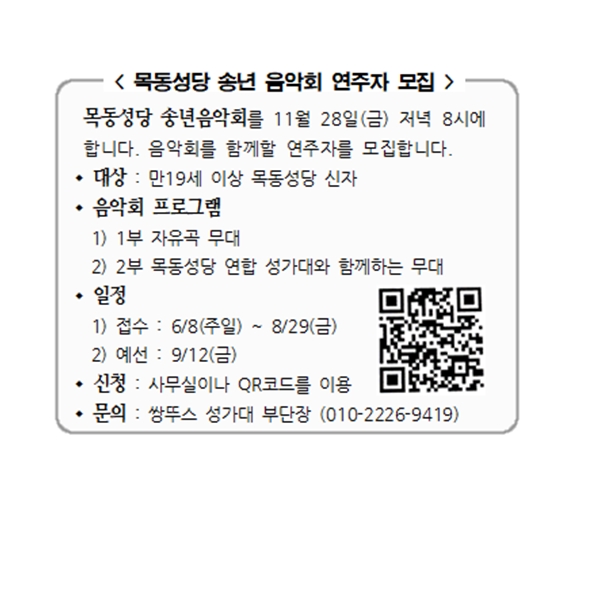 목동성당 송년 음악회 연주자 모집 페이지 정보 작성자 사무실 댓글 0건 조회Hit 844회 작성일Date 25-06-05 11:02 본문 목동성당 송년 음악회 연주자 모집 목록 이전글대입 수험생을 위한 백일기도(8/5~11/12) 25.06.05 다음글2차 헌금 25.05.29 댓글목록 댓글목록 등록된 댓글이 없습니다.