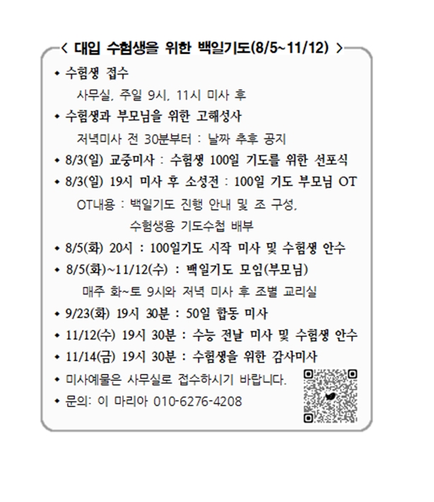 대입 수험생을 위한 백일기도(8/5~11/12)