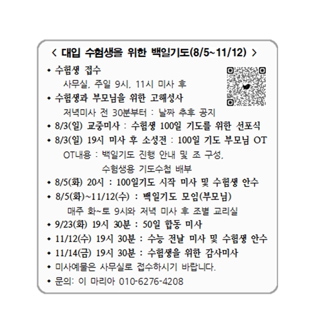 대입 수험생을 위한 백일기도(8/5~11/12) 페이지 정보 작성자 사무실 댓글 0건 조회Hit 865회 작성일Date 25-06-12 11:48 본문 대입 수험생을 위한 백일기도(8/5~11/12) 목록 이전글첫영성체 일정 안내 25.06.12 다음글목동성당 송년 음악회 연주자 모집 25.06.12 댓글목록 댓글목록 등록된 댓글이 없습니다.