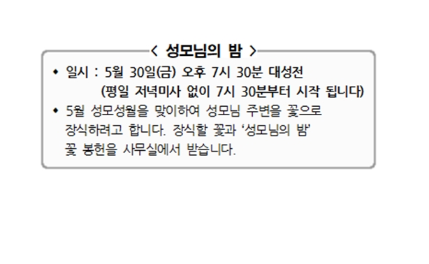성모님의 밤 페이지 정보 작성자 사무실 댓글 0건 조회Hit 859회 작성일Date 25-05-15 09:52 본문 성모님의 밤 목록 이전글5월 성모성월 묵주기도 25.05.15 다음글‘잃어버린 양 찾기’캠페인 25.05.15 댓글목록 댓글목록 등록된 댓글이 없습니다.