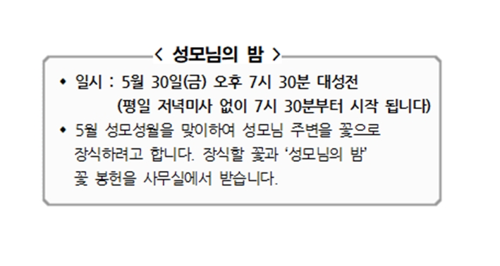 성모님의 밤 페이지 정보 작성자 사무실 댓글 0건 조회Hit 882회 작성일Date 25-05-08 09:10 본문 성모님의 밤 목록 이전글5월 성모성월 묵주기도 25.05.08 다음글방송미사에 관한 지침(주교회의 2025년 춘계 정기총회) 25.05.08 댓글목록 댓글목록 등록된 댓글이 없습니다.