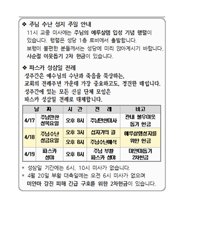 주님 수난 성지 주일 안내 및 파스카 성삼일 전례 페이지 정보 작성자 사무실 댓글 0건 조회Hit 1,193회 작성일Date 25-04-10 16:31 본문 주님 수난 성지 주일 안내 및 파스카 성삼일 전례 목록 이전글사순 저금통 25.04.17 다음글첫영성체 일정 안내 25.04.10 댓글목록 댓글목록 등록된 댓글이 없습니다.