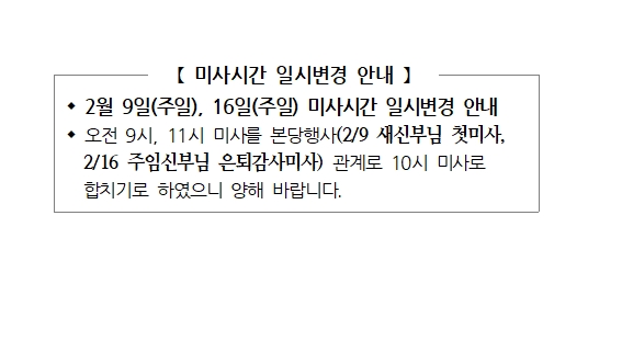미사시간 일시변경 안내 페이지 정보 작성자 사무실 댓글 0건 조회Hit 1,227회 작성일Date 25-02-06 09:31 본문 미사시간 일시변경 안내 목록 이전글강귀석 아우구스티노 주임신부님 은퇴 및 정 요한비따 수녀님 인사이동 25.02.06 다음글성지(聖枝) 회수 25.02.06 댓글목록 댓글목록 등록된 댓글이 없습니다.