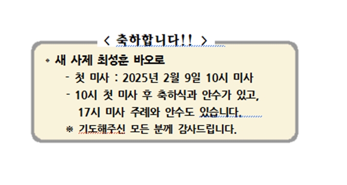 < 축하합니다!! > 페이지 정보 작성자 사무실 댓글 0건 조회Hit 1,335회 작성일Date 25-02-06 09:35 본문 < 축하합니다!! > 목록 이전글성지(聖枝) 회수 25.02.13 다음글강귀석 아우구스티노 주임신부님 은퇴 및 정 요한비따 수녀님 인사이동 25.02.06 댓글목록 댓글목록 등록된 댓글이 없습니다.