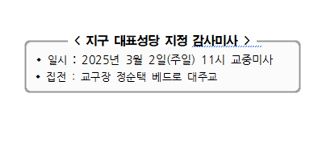 < 지구 대표성당 지정 감사미사 > 페이지 정보 작성자 사무실 댓글 0건 조회Hit 1,264회 작성일Date 25-02-27 09:30 본문 < 지구 대표성당 지정 감사미사 > 목록 이전글미사예물 봉헌 안내 25.03.06 다음글3월 첫 첨례 안내 25.02.27 댓글목록 댓글목록 등록된 댓글이 없습니다.