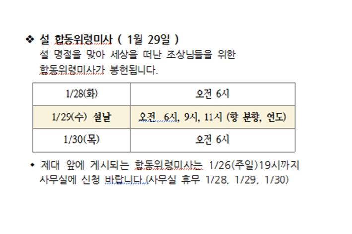 설 합동위령미사 ( 1월 29일 ) 페이지 정보 작성자 사무실 댓글 0건 조회Hit 1,252회 작성일Date 25-01-02 14:27 본문 설 합동위령미사 ( 1월 29일 ) 목록 이전글초 축성 및 제대초 · 제대꽃 봉헌 25.01.02 다음글사제 수품자를 위한 54일 기도 25.01.02 댓글목록 댓글목록 등록된 댓글이 없습니다.