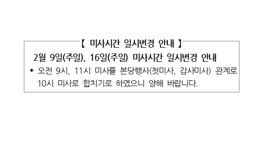 2월 9일(주일), 16일(주일) 미사시간 일시변경 안내 페이지 정보 작성자 사무실 댓글 0건 조회Hit 1,268회 작성일Date 25-01-16 09:44 본문 2월 9일(주일), 16일(주일) 미사시간 일시변경 안내 목록 이전글설 합동위령미사 ( 1월 29일 ) 25.01.16 다음글사제 수품자를 위한 54일 기도 25.01.16 댓글목록 댓글목록 등록된 댓글이 없습니다.