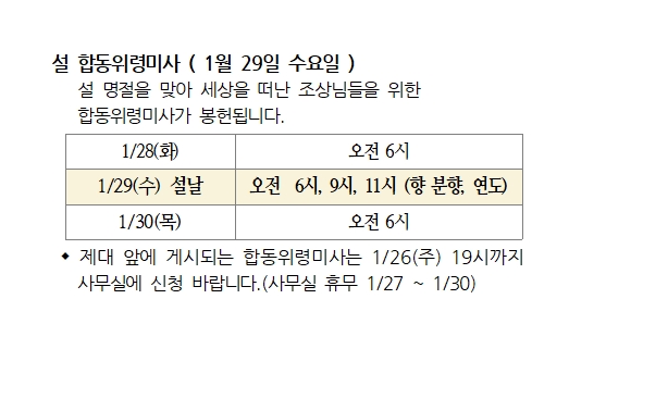 설 합동위령미사 ( 1월 29일 수요일 ) 페이지 정보 작성자 사무실 댓글 0건 조회Hit 1,164회 작성일Date 25-01-23 09:52 본문 설 합동위령미사 ( 1월 29일 수요일 ) 목록 이전글2월 첫 첨례 안내 25.01.23 다음글미사시간 일시변경 안내 25.01.23 댓글목록 댓글목록 등록된 댓글이 없습니다.