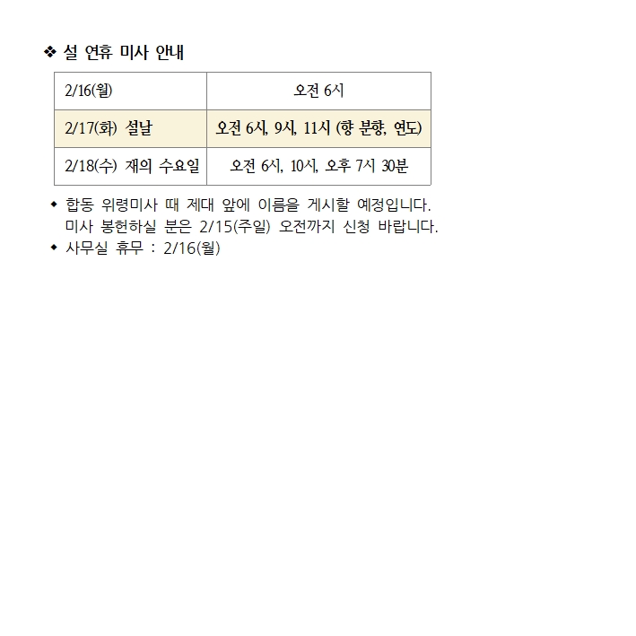 설 연휴 미사 안내 페이지 정보 작성자 사무실 댓글 0건 조회Hit 378회 작성일Date 26-02-05 11:00 본문 설 연휴 미사 안내 목록 이전글사제 인사이동 26.02.05 다음글재의 수요일 재의 예식과 사순절 십자가의 길 26.02.05 댓글목록 댓글목록 등록된 댓글이 없습니다.