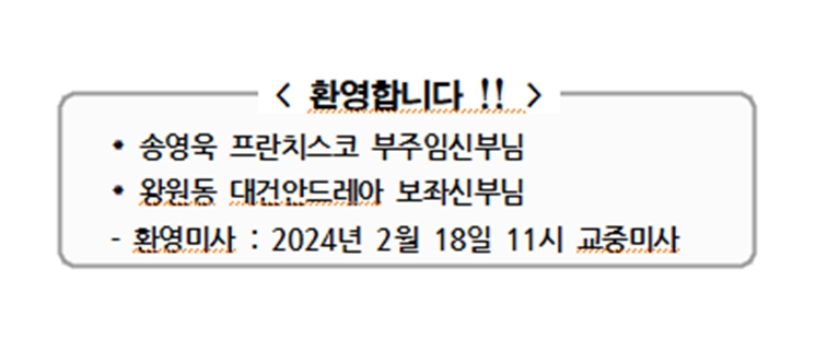 환영합니다 !! 페이지 정보 작성자 사무실 댓글 0건 조회Hit 3,381회 작성일Date 24-02-15 13:42 본문 환영합니다 !! 목록 이전글2027년 서울 세계청년대회( WYD )를 위한 ‘묵주기도 10억단 바치기 운동’ 24.02.21 다음글수녀님 인사 이동 24.02.15 댓글목록 댓글목록 등록된 댓글이 없습니다.