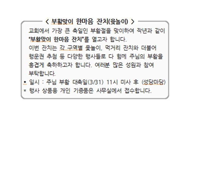 부활맞이 한마음 잔치(윷놀이) 페이지 정보 작성자 사무실 댓글 0건 조회Hit 3,374회 작성일Date 24-03-07 09:20 본문 부활맞이 한마음 잔치(윷놀이) 목록 이전글이경상(바오로) 새 보좌주교님을 위한 영적예물과 9일기도 24.03.07 다음글사순절 전례 생활 24.02.29 댓글목록 댓글목록 등록된 댓글이 없습니다.