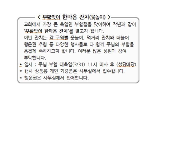 부활맞이 한마음 잔치(윷놀이) 페이지 정보 작성자 사무실 댓글 0건 조회Hit 3,288회 작성일Date 24-03-20 14:38 본문 부활맞이 한마음 잔치(윷놀이) 목록 이전글성삼일 전례 24.03.20 다음글사순절 전례 생활 24.03.13 댓글목록 댓글목록 등록된 댓글이 없습니다.