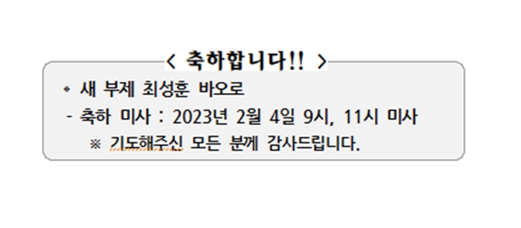 축하합니다!! 페이지 정보 작성자 사무실 댓글 0건 조회Hit 3,442회 작성일Date 24-02-01 16:35 본문 축하합니다!! 목록 이전글재의 수요일 재의 예식과 사순절 십자가의 길 24.02.08 다음글서성훈 바오로 신부님, 박준영 제피리노 신부님 인사이동 24.02.01 댓글목록 댓글목록 등록된 댓글이 없습니다.