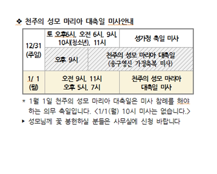 천주의 성모 마리아 대축일 미사안내 페이지 정보 작성자 사무실 댓글 0건 조회Hit 3,920회 작성일Date 23-12-27 11:28 본문 천주의 성모 마리아 대축일 미사안내 목록 이전글새해 하느님의 풍성한 은총이 함께 하시길~ 23.12.27 다음글초 축성 및 제대초 · 제대꽃 봉헌 23.12.27 댓글목록 댓글목록 등록된 댓글이 없습니다.