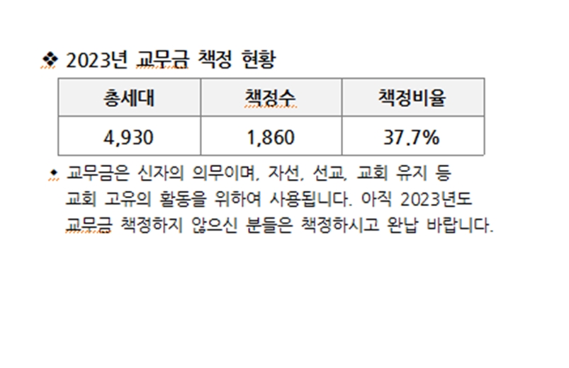 2023년 교무금 책정 현황 페이지 정보 작성자 사무실 댓글 0건 조회Hit 3,579회 작성일Date 23-11-22 14:00 본문 2023년 교무금 책정 현황 목록 이전글축하합니다! 23.11.25 다음글주일학교 학생에게 성탄 선물 주고 기도 받기 23.11.22 댓글목록 댓글목록 등록된 댓글이 없습니다.