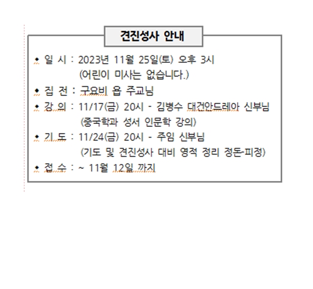 견진성사 안내 페이지 정보 작성자 사무실 댓글 0건 조회Hit 3,548회 작성일Date 23-11-09 09:57 본문 견진성사 안내 목록 이전글평신도 주일 2차헌금 23.11.09 다음글태아 축복예식 23.11.09 댓글목록 댓글목록 등록된 댓글이 없습니다.