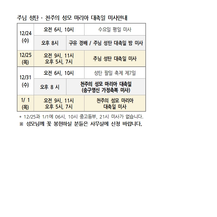 주님 성탄 · 천주의 성모 마리아 대축일 미사안내 페이지 정보 작성자 사무실 댓글 0건 조회Hit 818회 작성일Date 25-12-20 13:42 본문 주님 성탄 · 천주의 성모 마리아 대축일 미사안내 목록 이전글국세청 기부금 영수증 발급 변경 안내 25.12.25 다음글중고등부주일학교 성탄맞이 물품판매 25.12.20 댓글목록 댓글목록 등록된 댓글이 없습니다.