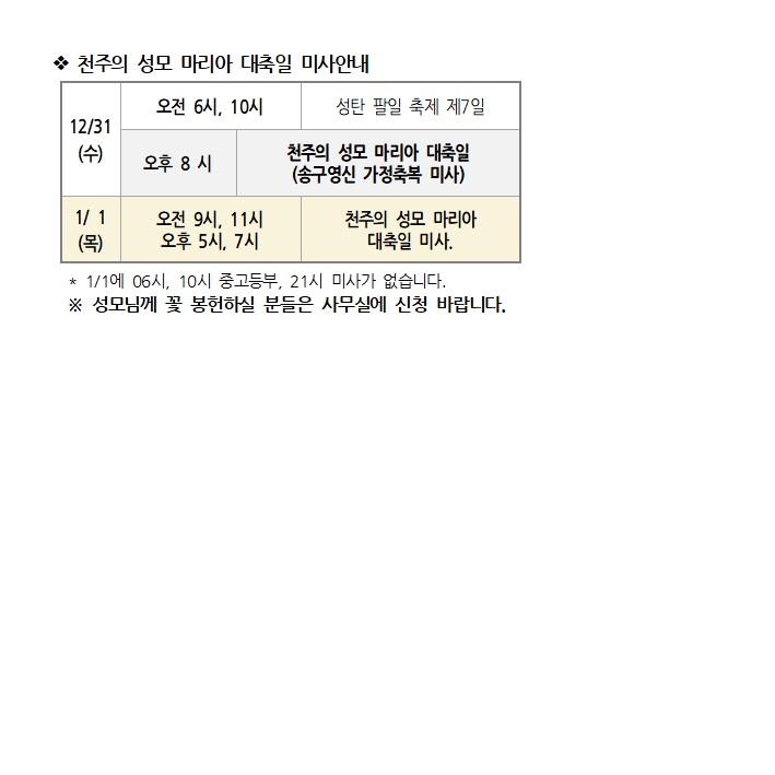 천주의 성모 마리아 대축일 미사안내 페이지 정보 작성자 사무실 댓글 0건 조회Hit 650회 작성일Date 25-12-25 18:29 본문 천주의 성모 마리아 대축일 미사안내 목록 이전글빈첸시오회 애긍함 설치 26.01.01 다음글가족미사 함께 참여하기 운동 25.12.25 댓글목록 댓글목록 등록된 댓글이 없습니다.