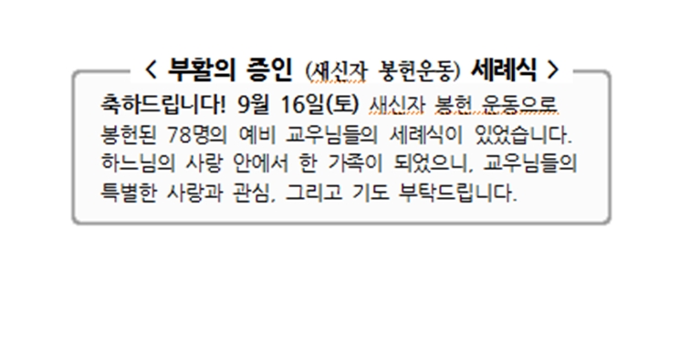 부활의 증인 (새신자 봉헌운동) 세례식 페이지 정보 작성자 사무실 댓글 0건 조회Hit 3,881회 작성일Date 23-09-13 10:02 본문 부활의 증인 (새신자 봉헌운동) 세례식 목록 이전글2024년 혼인 예약 접수 23.09.20 다음글헌미헌금 특별헌금 23.09.13 댓글목록 댓글목록 등록된 댓글이 없습니다.