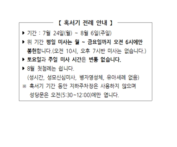 혹서기 전례 안내 페이지 정보 작성자 사무실 댓글 0건 조회Hit 4,545회 작성일Date 23-07-19 14:17 본문 혹서기 전례 안내 목록 이전글감사합니다. 23.08.02 다음글카카오톡에서 목동성당을 친구로 만나세요. 23.07.19 댓글목록 댓글목록 등록된 댓글이 없습니다.
