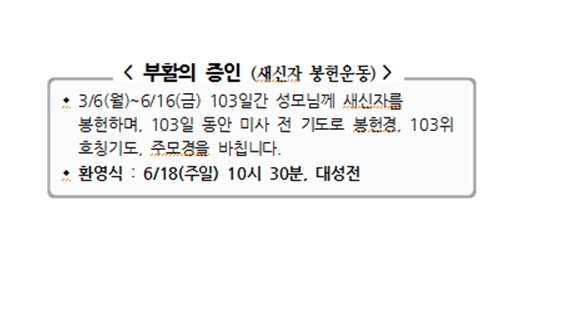 부활의 증인 (새신자 봉헌운동) 페이지 정보 작성자 사무실 댓글 0건 조회Hit 3,860회 작성일Date 23-06-14 15:08 본문 부활의 증인 (새신자 봉헌운동) 목록 이전글7월 첫 첨례 안내 23.06.21 다음글세례를 축하합니다! 23.06.14 댓글목록 댓글목록 등록된 댓글이 없습니다.