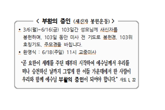 부활의 증인 (새신자 봉헌운동) 페이지 정보 작성자 사무실 댓글 0건 조회Hit 3,951회 작성일Date 23-05-11 09:38 본문 부활의 증인 (새신자 봉헌운동) 목록 이전글6월 성시간 안내 23.05.18 다음글2023년 교무금 책정 현황 23.05.11 댓글목록 댓글목록 등록된 댓글이 없습니다.