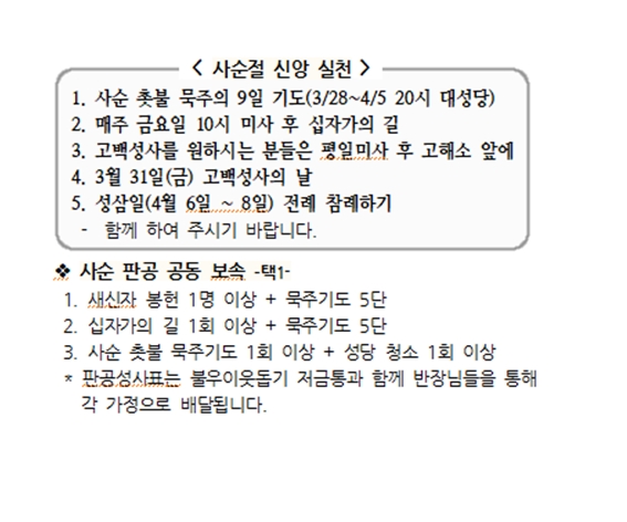 사순절 신앙 실천 및 사순 판공 공동 보속 –택1- 페이지 정보 작성자 사무실 댓글 0건 조회Hit 4,901회 작성일Date 23-03-08 10:41 본문 사순절 신앙 실천 및 사순 판공 공동 보속 –택1- 목록 이전글2023년 교무금 책정 현황 23.03.15 다음글3월 첫 첨례 안내 23.02.22 댓글목록 댓글목록 등록된 댓글이 없습니다.