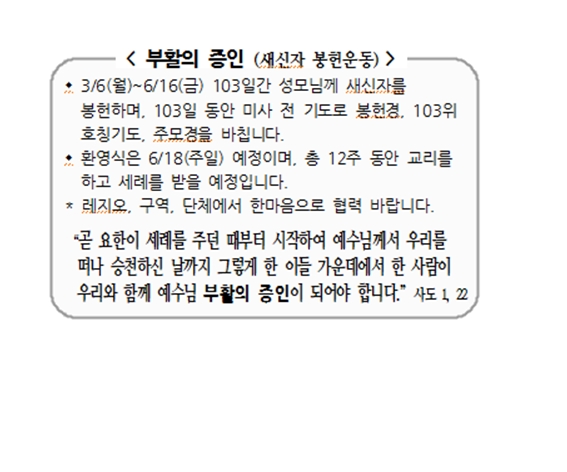 부활의 증인 (새신자 봉헌운동) 페이지 정보 작성자 사무실 댓글 0건 조회Hit 4,402회 작성일Date 23-03-15 11:22 본문 부활의 증인 (새신자 봉헌운동) 목록 이전글사순절 신앙 실천 및 사순 판공 공동 보속 –택1- 23.03.15 다음글부활맞이 한마음 잔치(윷놀이) 23.03.15 댓글목록 댓글목록 등록된 댓글이 없습니다.