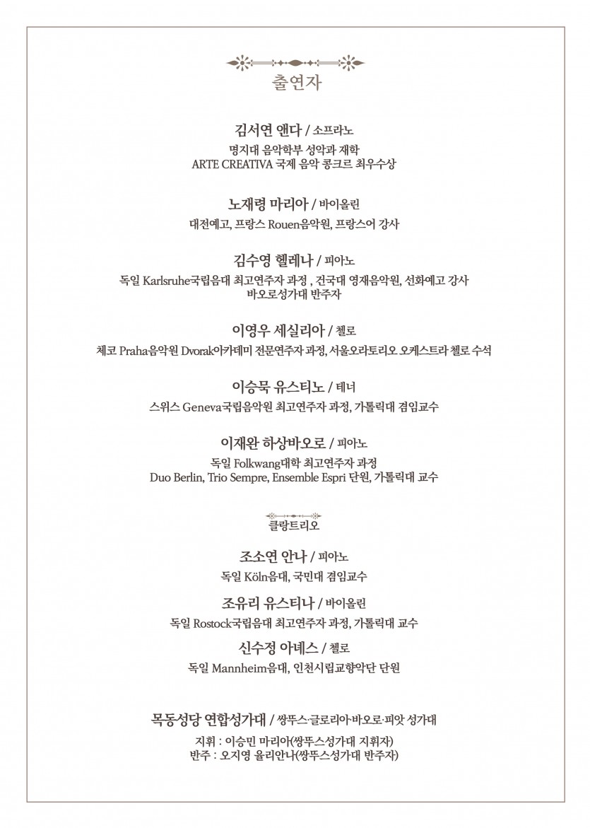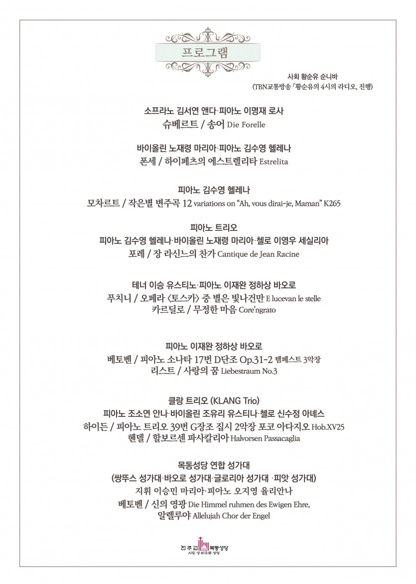 한 해 동안 베풀어주신 하느님의 은혜에 감사드리며, 따뜻한 마음을 나눌 수 있는 음악회를 마련하였습니다.