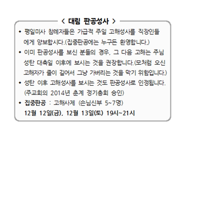 대림 판공성사 페이지 정보 작성자 사무실 댓글 0건 조회Hit 540회 작성일Date 25-11-28 12:54 본문 대림 판공성사 목록 이전글12월 첫 첨례 안내 25.11.28 다음글목동성당 송년 음악회 25.11.25 댓글목록 댓글목록 등록된 댓글이 없습니다.