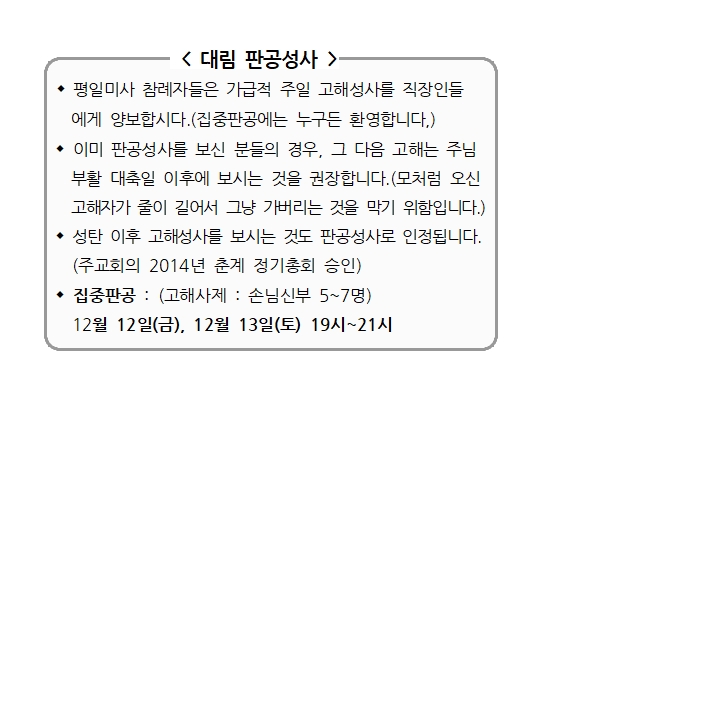 대림 판공성사 페이지 정보 작성자 사무실 댓글 0건 조회Hit 611회 작성일Date 25-12-04 18:15 본문 대림 판공성사 목록 이전글2026년 성서 40주간 안내 25.12.20 다음글주님 성탄 · 천주의 성모 마리아 대축일 미사안내 25.12.04 댓글목록 댓글목록 등록된 댓글이 없습니다.