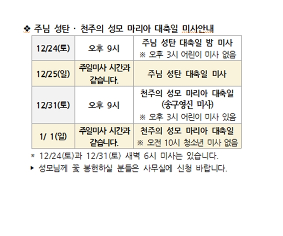 주님 성탄 · 천주의 성모 마리아 대축일 미사안내 페이지 정보 작성자 사무실 댓글 0건 조회Hit 4,860회 작성일Date 22-12-14 10:22 본문 주님 성탄 · 천주의 성모 마리아 대축일 미사안내 목록 이전글사제 수품자를 위한 54일 기도 22.12.14 다음글주일학교 학생에게 성탄 선물 주고 기도 받기 22.12.14 댓글목록 댓글목록 등록된 댓글이 없습니다.