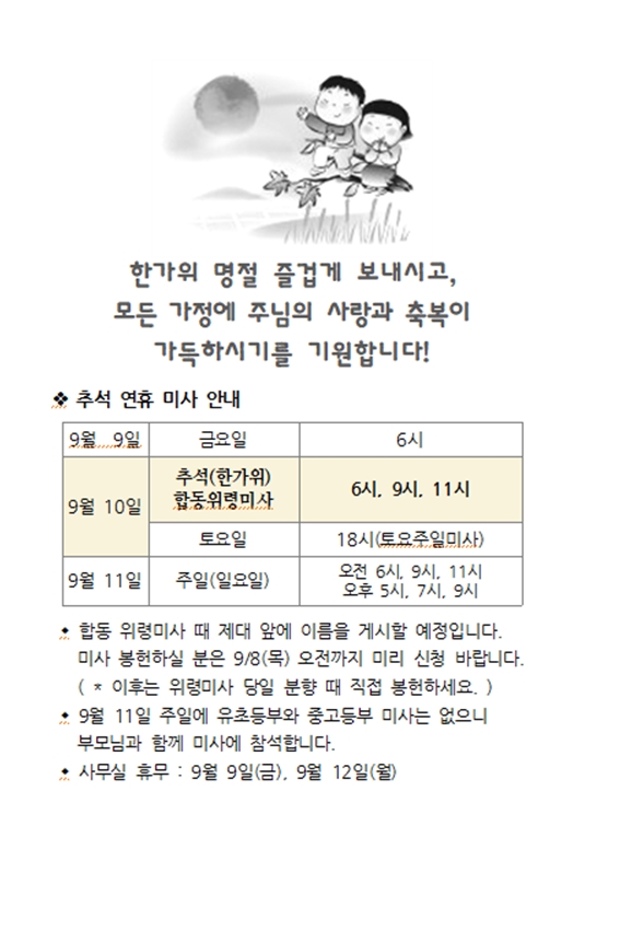추석 연휴 미사 안내 페이지 정보 작성자 사무실 댓글 0건 조회Hit 4,799회 작성일Date 22-09-01 15:30 본문 추석 연휴 미사 안내 목록 이전글2022년 교무금 책정 현황 22.09.07 다음글강귀석(아우구스티노) 주임신부님 영명축일 22.08.24 댓글목록 댓글목록 등록된 댓글이 없습니다.