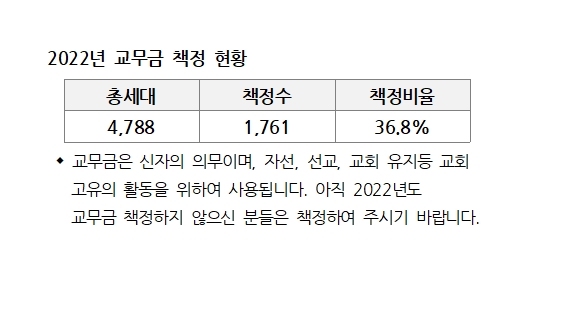 2022년 교무금 책정 현황 페이지 정보 작성자 사무실 댓글 0건 조회Hit 4,770회 작성일Date 22-08-11 15:33 본문 2022년 교무금 책정 현황 목록 이전글박준영(제피리노) 보좌신부님 영명축일 22.08.11 다음글추석 합동 위령미사 안내 22.08.11 댓글목록 댓글목록 등록된 댓글이 없습니다.