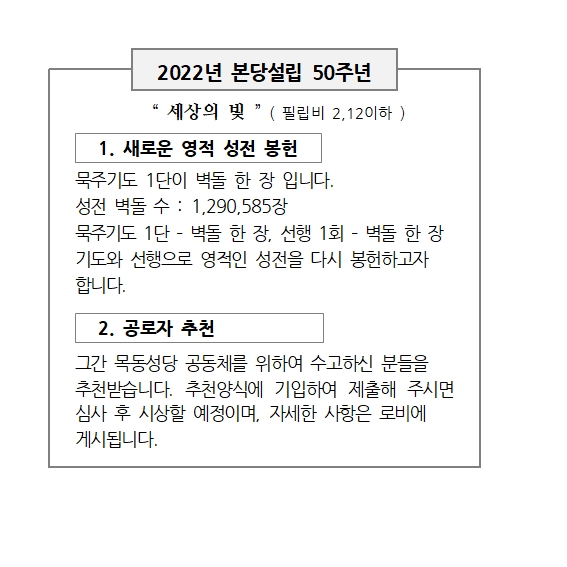 2022년 본당설립 50주년 페이지 정보 작성자 사무실 댓글 0건 조회Hit 4,798회 작성일Date 21-07-31 15:12 본문 2022년 본당설립 50주년 목록 이전글미사 안내(7/26~8/8) 21.07.31 다음글미사 안내 (7/12~7/25) 21.07.15 댓글목록 댓글목록 등록된 댓글이 없습니다.
