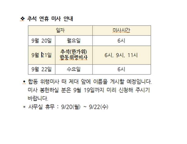 추석 연휴 미사 안내 페이지 정보 작성자 사무실 댓글 0건 조회Hit 4,924회 작성일Date 21-09-04 08:43 본문 추석 연휴 미사 안내 목록 이전글2022년 본당설립 50주년 21.09.04 다음글최영진(그레고리오) 보좌신부님 영명축일 21.08.26 댓글목록 댓글목록 등록된 댓글이 없습니다.