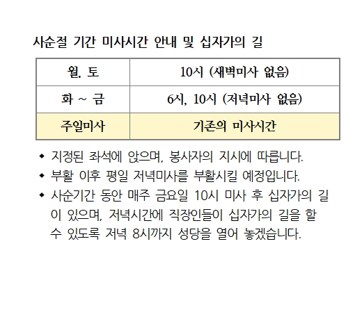 사순절 기간 미사시간 안내 및 십자가의 길 페이지 정보 작성자 사무실 댓글 0건 조회Hit 4,987회 작성일Date 21-03-18 15:12 본문 사순절 기간 미사시간 안내 및 십자가의 길 목록 이전글4월 평일 미사안내 21.03.25 다음글성주간 전례 21.03.18 댓글목록 댓글목록 등록된 댓글이 없습니다.