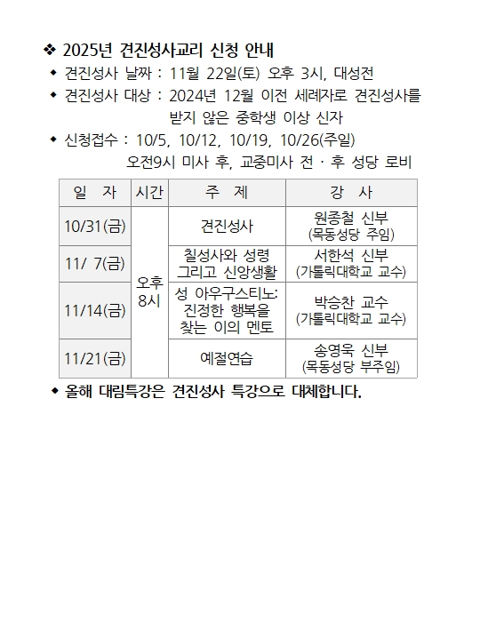 2025년 견진성사교리 신청 안내 페이지 정보 작성자 사무실 댓글 0건 조회Hit 818회 작성일Date 25-10-02 16:34 본문 2025년 견진성사교리 신청 안내 목록 이전글10월 묵주기도 성월(함께 바치는 묵주기도) 25.10.02 다음글2026년도 본당 달력 광고 안내 25.10.02 댓글목록 댓글목록 등록된 댓글이 없습니다.