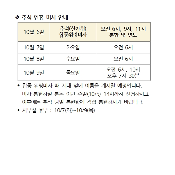 추석 연휴 미사 안내 페이지 정보 작성자 사무실 댓글 0건 조회Hit 886회 작성일Date 25-10-02 16:36 본문 추석 연휴 미사 안내 목록 이전글2026년도 본당 달력 광고 안내 25.10.11 다음글10월 묵주기도 성월(함께 바치는 묵주기도) 25.10.02 댓글목록 댓글목록 등록된 댓글이 없습니다.