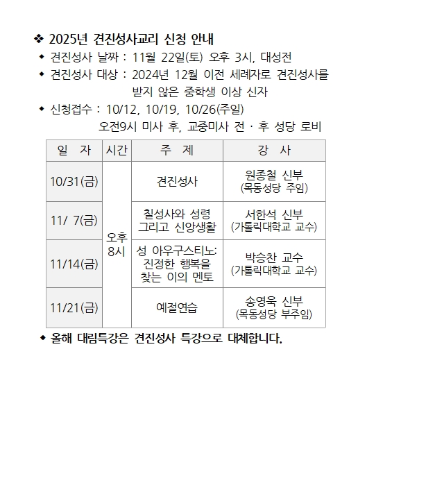 2025년 견진성사교리 신청 안내 페이지 정보 작성자 사무실 댓글 0건 조회Hit 634회 작성일Date 25-10-11 13:36 본문 2025년 견진성사교리 신청 안내 목록 이전글군인주일 2차헌금 25.10.11 다음글이웃사랑 실천 헌 옷, 신발, 가방, 악세사리 등 모음 25.10.11 댓글목록 댓글목록 등록된 댓글이 없습니다.