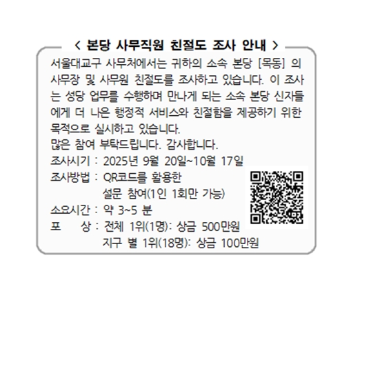 본당 사무직원 친절도 조사 안내 페이지 정보 작성자 홍보부 댓글 0건 조회Hit 750회 작성일Date 25-09-18 11:10 본문 본당 사무직원 친절도 조사 안내 목록 이전글대입 수험생을 위한 백일기도(8/5~11/12) 25.09.18 다음글반려동물 축복식 25.09.18 댓글목록 댓글목록 등록된 댓글이 없습니다.