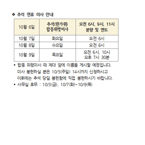 추석 연휴 미사 안내 페이지 정보 작성자 홍보부 댓글 0건 조회Hit 786회 작성일Date 25-09-18 11:11 본문 추석 연휴 미사 안내 목록 이전글수녀님들이 농사지으신 3색 현미 찹쌀 판매 25.09.18 다음글대입 수험생을 위한 백일기도(8/5~11/12) 25.09.18 댓글목록 댓글목록 등록된 댓글이 없습니다.