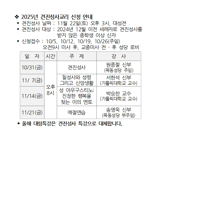 2025년 견진성사교리 신청 안내 페이지 정보 작성자 사무실 댓글 0건 조회Hit 763회 작성일Date 25-09-25 09:50 본문 2025년 견진성사교리 신청 안내 목록 이전글2026년도 본당 달력 광고 안내 25.09.25 다음글2차 헌금 25.09.18 댓글목록 댓글목록 등록된 댓글이 없습니다.